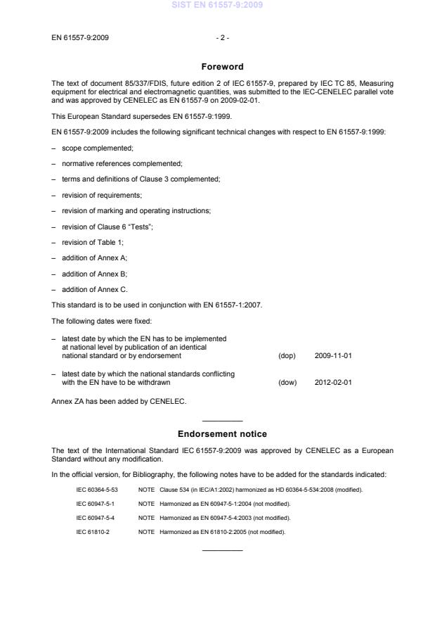 EN 61557-9:2009 has the following relationships with other standards: It is inter standard links to EN 61557-9:1999, EN 61557-9:2015. Understanding these relationships helps ensure you are using the most current and applicable version of the standard.