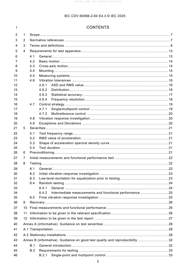 prEN IEC 60068-2-64:2025 is an important draft international standard published by CLC, focusing on environmental testing - specifically, Test Fh: Vibration, broadband random and guidance. This standard outlines procedures for subjecting products, components, and systems to random vibration tests that simulate real-world stochastic mechanical stresses experienced during transportation, handling, or operational environments. Using digital, computer-controlled vibration generators, the standard provides guidance on test setup, measurement, control strategies, and quality assurance. The goal is to ensure product reliability and performance under realistic vibrational conditions.