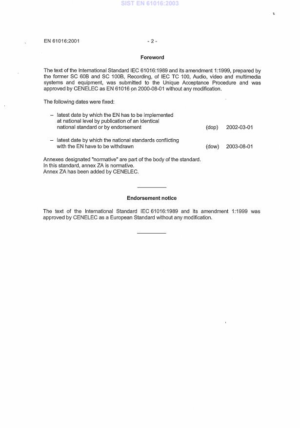 Keywords: EN 61016:2001, D‑1 format, helical‑scan digital component video, 19 mm magnetic tape, digital audio, CCIR 601, CCIR 656, EN 60958, interchangeability, 525/60, 625/50.