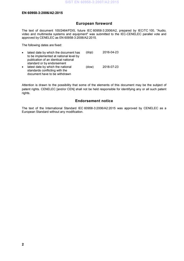 This amendment A2 modifies the European Standard EN 60958-3:2006; it was approved by CENELEC on 2015-07-23. CENELEC