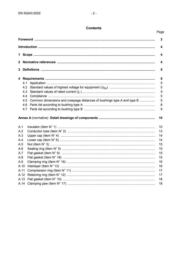 EN 50243:2002 is a standard published by CLC. Its full title is "Outdoor bushings for 24 kV and 36 kV and for 5 kA and 8 kA, for liquid filled transformers". This standard covers: This standard is applicable to ceramic insulated outdoor bushings for highest voltages for equipment of 24 kV and 36 kV, with rated currents of 5 kA and 8 kA and frequencies from 15 Hz up to 60 Hz for insulating liquid filled transformers. This standard establishes dimensions to ensure interchangeability and adequate mounting of bushings. Two types of construction are specified, type A and type B, both types for highest voltages for equipment 24 kV and 36 kV and rated currents of 5 kA and 8 kA. The mechanical stresses of the conductor tube make the difference between type A and type B. The conductor tube of type A is axially and radially fixed in the top of the bushing. The inner line terminal of the transformer can be flexible and without any special support for the lower end of the conductor tube. In case of type B, the conductor tube is only radially fixed in the top of the bushing. In that case, a rigid support has to be mounted to fix the lower end of the conductor tube (for example, in combination with a drip proofed sealing end). The drip proofed sealing end is often required in the service requirements. In this case, it is not possible to use type A because of the existing double fixation. Therefore, both bushing types A and B have to be specified. The condition for the usage of type B is that the drip prooved sealing end is able to withstand the mechanical stress in axial direction.