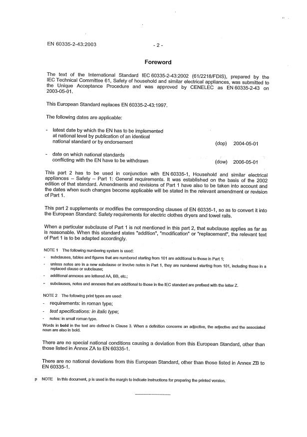 EN 60335-2-43:2003 is a standard published by CLC. Its full title is "Household and similar electrical appliances - Safety - Part 2-43: Particular requirements for clothes dryers and towel rails". This standard covers: Deals with the safety of electric clothes dryers for drying textiles on racks located in a warm airflow and to electric towel rails, for household and similar purposes, their rated voltage being not more than 250 V. The clothes racks may be fixed or free-standing in a cabinet. The air circulation may be natural or forced. This standard does not apply to tumble dryers (refer to EN 60335-2-11 for tumble dryers).
