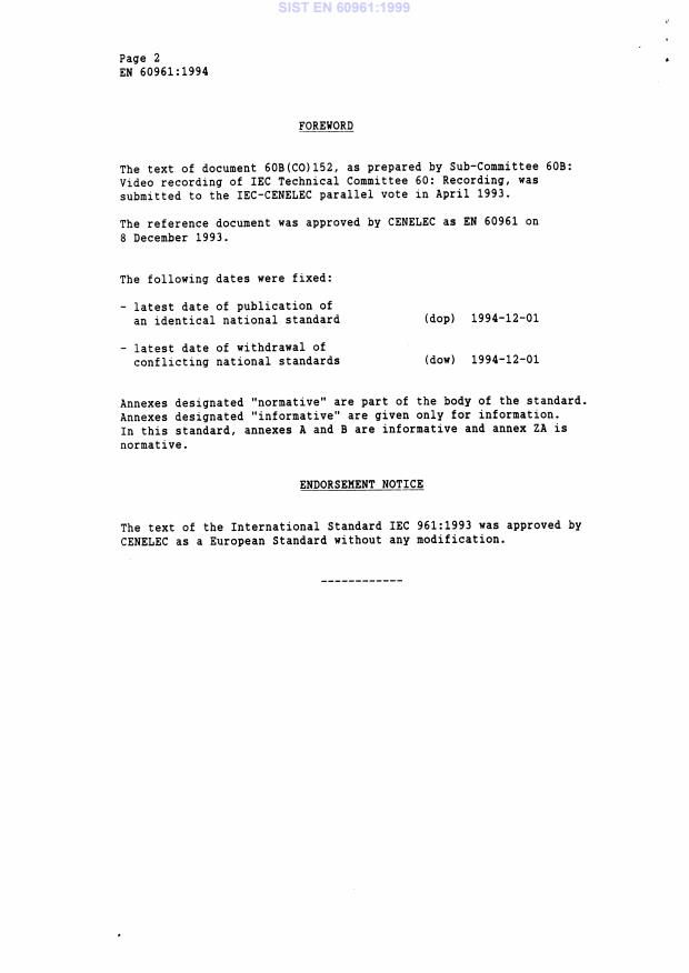 EN 60961:1994 (based on IEC 961:1993) specifies a helical‑scan video tape cassette system using 12,65 mm (0.5 in) magnetic tape on type L format, intended for broadcast‑quality video recording and reproduction. The standard defines mechanical and electrical requirements to ensure interchangeability of tapes and recorders for both 525/60 and 625/50 television systems. It also specifies two recording modes: MODE I (oxide particle tape) and MODE II (metal particle tape, permitting FM audio).