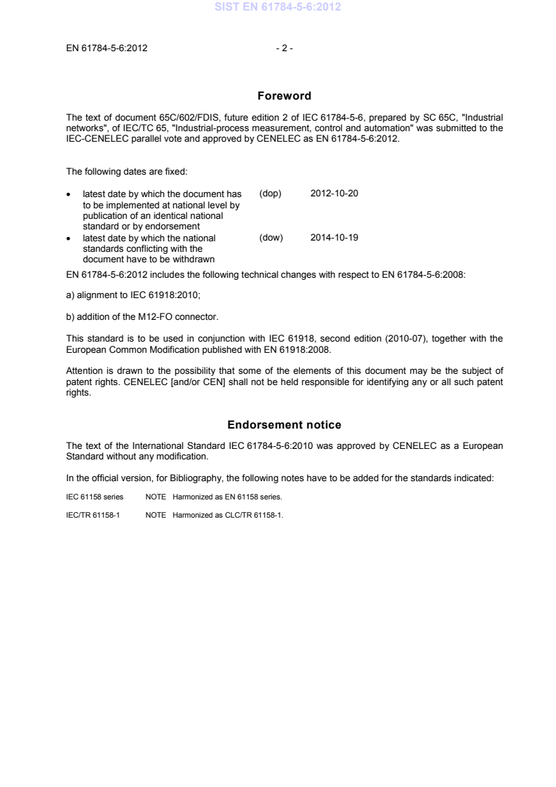 Endorsement notice The text of the International Standard IEC 61784-5-6:2010 was approved by CENELEC as a European Standard without any modification. In the official version, for Bibliography, the following notes have to be added for the standards indicated: IEC 61158 series NOTE
