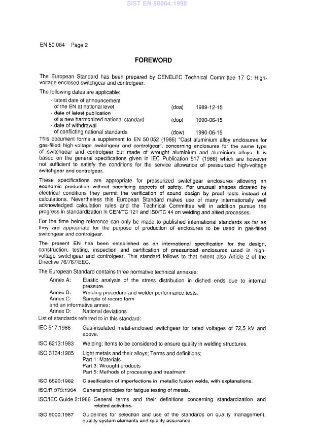 EN 50064:1989 is a standard published by CLC. Its full title is "Wrought aluminium and aluminium alloy enclosures for gas-filled high-voltage switchgear and controlgear". This standard covers: This standard applies to fusion welded wrought aluminium and aluminium alloy enclosures pressurized with dry air, inert gases, for example sulphur hexafluoride or nitrogen or a mixture of such gases, used in indoor or outdoor installations of high-voltage switchgear and controlgear with rated voltages of 72,5 kV and above, where the gas is used principally for its dielectric and/or arc-quenching properties. The enclosures comprise parts of electrical equipment not necessarily limited to the following examples: circuit-breakers, switch-disconnectors, disconnectors, earthing switches, current transformers, voltage transformers, surge arrestors, busbars and connections. The scope covers also pressurized components such as the centre-chamber of live tank switchgear and controlgear, gas-insulated current transformers, etc.
