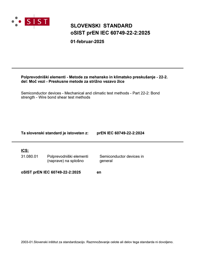Polprevodniški elementi - Metode za mehansko in klimatsko preskušanje - 22-2. del: Moč vezi - Preskusne metode za strižno vezavo žice (IEC 60749-22-2:2025)