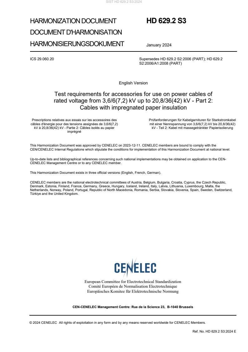 HD 629.2 S3:2024 - Test requirements for accessories for use on power cables of rated voltage from 3,6/6(7,2) kV up to 20,8/36(42) kV - Part 2: Cables with impregnated paper insulation - is a CLC/CENELEC harmonization document that defines type test performance requirements for cable accessories intended for use with impregnated paper insulated power cables (as specified in HD 621). The document sets out which accessories are covered, the rated voltages, test assemblies, test sequences and reporting requirements. Test methods are referenced from EN 61442:2005.