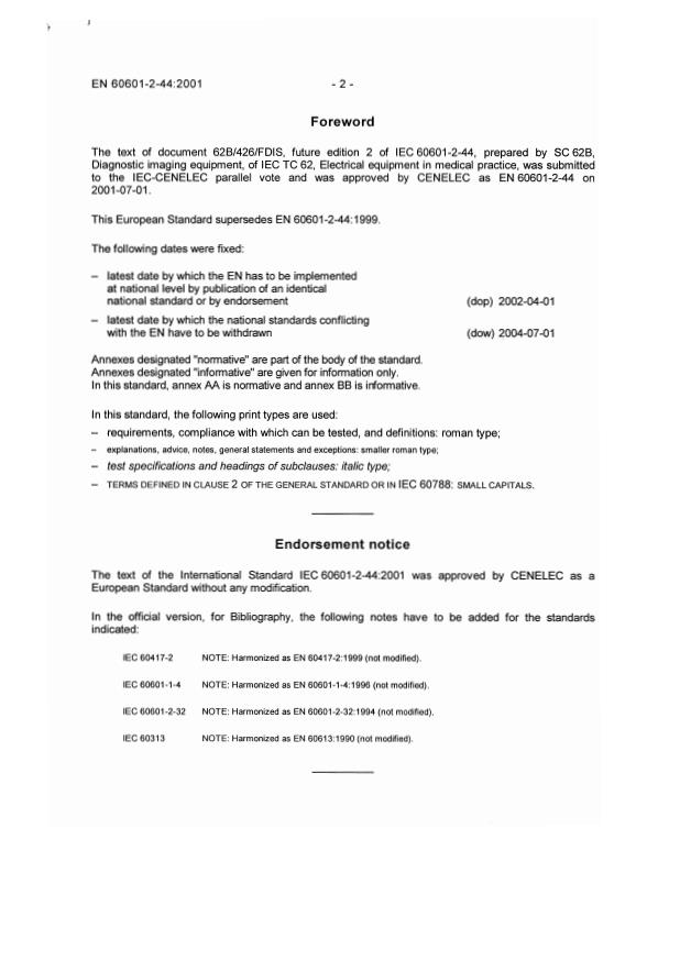 EN 60601-2-44:2001 is a standard published by CLC. Its full title is "Medical electrical equipment - Part 2-44: Particular requirements for the safety of X-ray equipment for computed tomography". This standard covers: Applies to X-ray equipment for computed tomography (CT scanners). Includes safety requirements for the X-ray generator, and those where high voltage generators are integrated with an X-ray tube assembly. Specify methods for demonstrating compliance with those requirements for CT scanners.