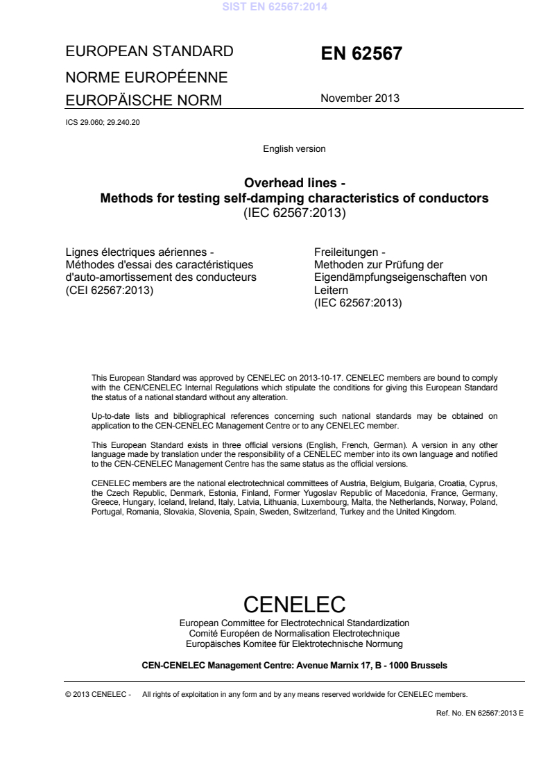 EN 62567:2013 is a standard published by CLC. Its full title is "Overhead lines - Methods for testing self-damping characteristics of conductors". This standard covers: IEC 62567:2013 provides test procedures based on the documents mentioned in the introduction and devoted to minimize the causes of discrepancy between test results, taking into consideration the large experience accumulated in the last 30 years by numerous test engineers and available in literature, including a CIGRE Technical Brochure specifically referring to this standard (see Bibliography). This Standard describes the current methodologies, including apparatus, procedures and accuracies, for the measurement of conductor self-damping and for the data reduction formats. In addition, some basic guidance is also provided to inform the potential user of a given method's strengths and weaknesses. The methodologies and procedures incorporated in this Standard are applicable only to testing on indoor laboratory spans. Key words: Overhead lines, Self-damping, Conductors