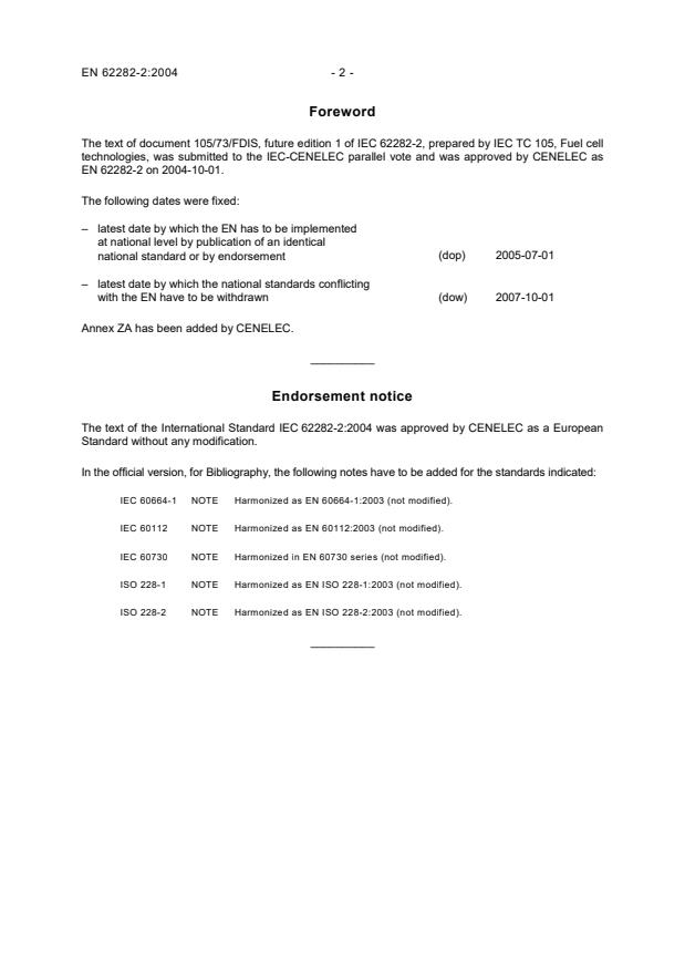 2007-10-01 Annex ZA has been added by CENELEC. __________ Endorsement notice The text of the International Standard IEC 62282-2:2004 was approved by CENELEC as a European Standard without any modification. In the official version, for Bibliography, the following notes have to be added for the standards indicated: IEC 60664-1 NOTE Harmonized as EN 60664-1:2003 (not modified). IEC 60112 NOTE Harmonized as EN 60112:2003 (not modified). IEC 60730 NOTE Harmonized in EN 60730 series (not modified). ISO 228-1 NOTE Harmonized as EN ISO 228-1:2003 (not modified). ISO 228-2 NOTE Harmonized as EN ISO 228-2:2003 (not modified). __________