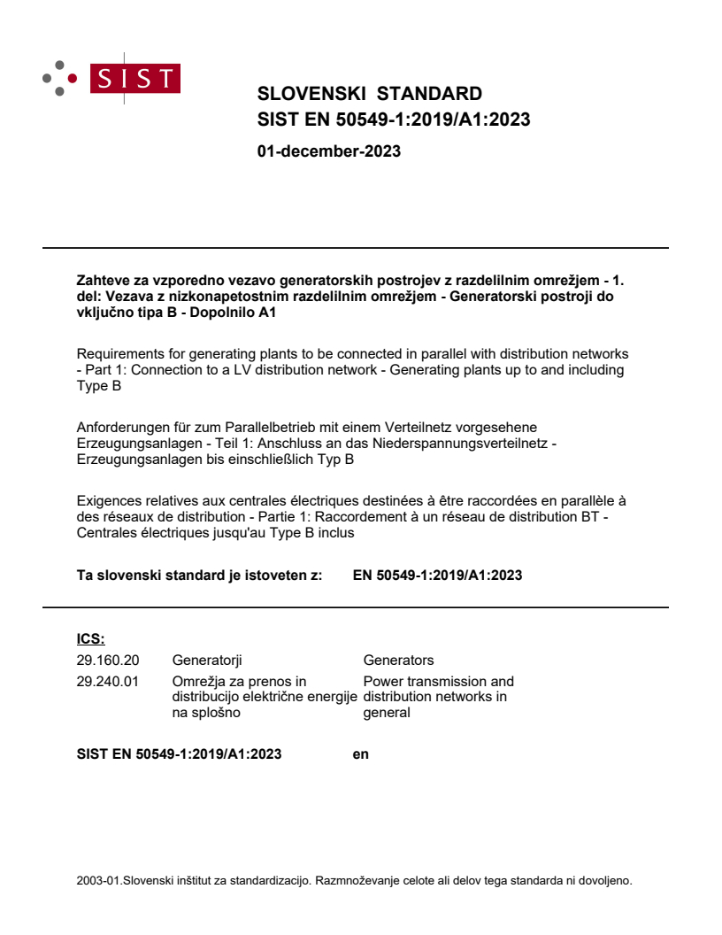Ta slovenski standard je istoveten z: EN 50549-1:2019/A1:2023