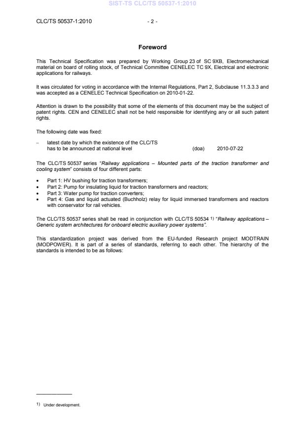 CLC/TS 50537-1:2010 is a technical specification published by CLC. Its full title is "Railway applications - Mounted parts of the traction transformer and cooling system - Part 1: HV bushing for traction transformers". This standard covers: This Technical Specification is applicable to high voltage (HV) bushings, intended for use in traction transformers of rail vehicles, cooled by insulating liquid with rated voltages up to 25 kV single phase and rated currents up to 630 A at frequencies from 16,7 Hz to 60 Hz. HV bushings within the scope of this Technical Specification are bushings for separable connectors that connect the power supply coming from a contact wire or from a contact rail to the primary winding of the traction transformer. The Technical Specification only deals with HV bushings that are mounted to the transformer. CLC/TS 50537-1 gives consideration to both technical and normative requirements of the railway environment and restricts the variety provided by industry-wide standards for bushings, such as EN 50180 and EN 60137. It determines requirements and tests enabling the interchangeability especially regarding electrical and mechanical interfaces. Furthermore, service conditions are described. The cable plug as the counterpart of the HV bushing’s plug-in end is not covered by this Technical Specification.