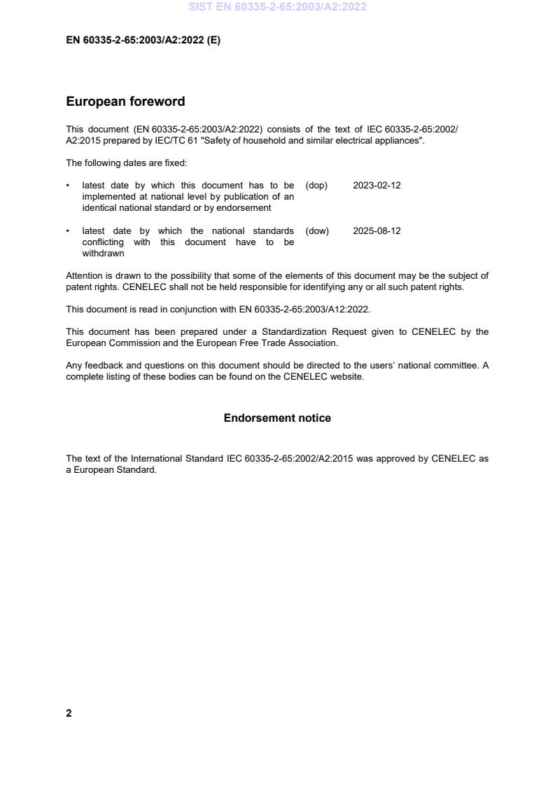This amendment A2 modifies the European Standard EN 60335-2-65:2003; it was approved by CENELEC on 2022-05-04. CENELEC