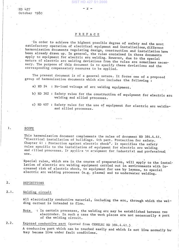 HD 427 S1:1981 is a standardization document published by CLC. Its full title is "Specific safety rules for the installation of equipment for electric arc welding and allied processes". This standard covers: This harmonization document complements the rules of document HD 384.4.41, "Electrical installation of buildings, 4th part: Protection for safety, Chapter 41 : Protection against electric shock". It specifies the safety rules specific to the installation of equipment for electric arc welding allied processes. It applies to equipment for industrial and professional use. Special rules, which are in the course of preparation, will apply to the installation of electric arc welding equipment carried out in environments with increased risk of electric shock, to equipment for use by layman, to special electric arc welding processes (e.g. plasma) and to underwater welding.