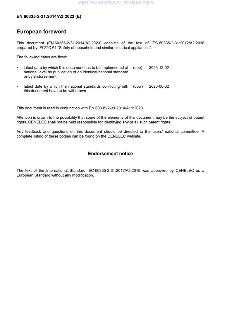 This document (EN 60335-2-31:2014/A2:2023) consists of the text of IEC 60335-2-31:2012/A2:2018