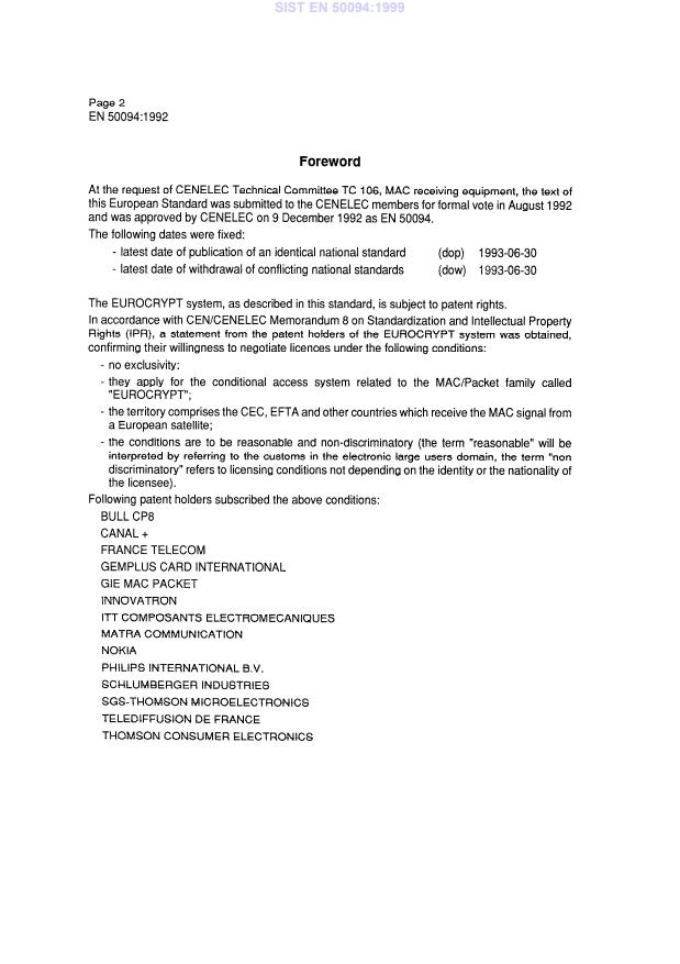 Keywords: EN 50094, EUROCRYPT, access control system, conditional access, MAC/packet family, pay TV, television broadcasting, radio broadcasting, CLC.