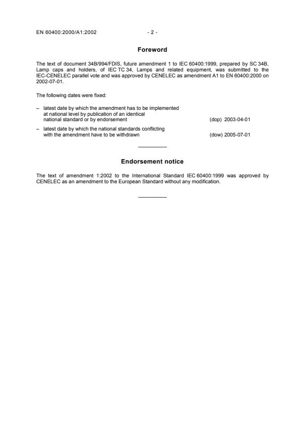 This amendment A1 modifies the European Standard EN 60400:2000; it was approved by CENELEC on