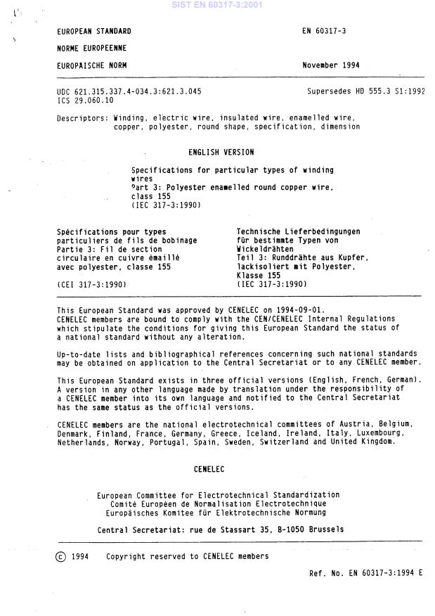 EN 60317-3:1994 is a standard published by CLC. Its full title is "Specifications for particular types of winding wires - Part 3: Polyester enamelled round copper wire, class 155". This standard covers: EN withdrawn