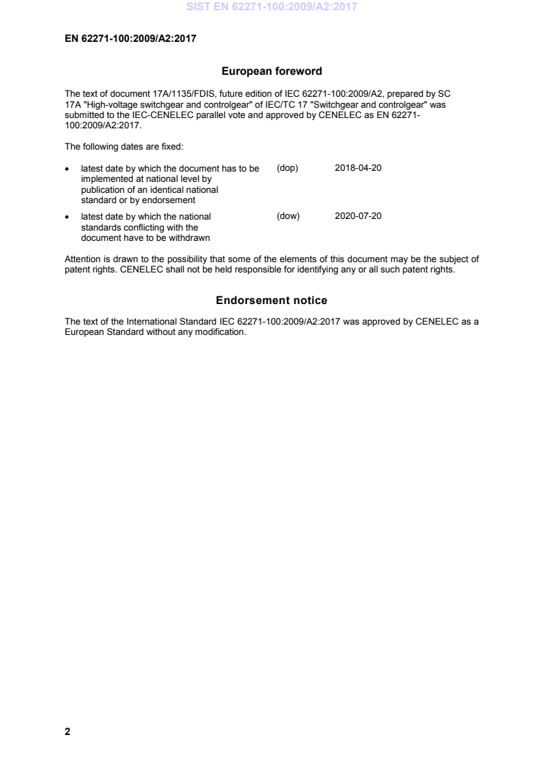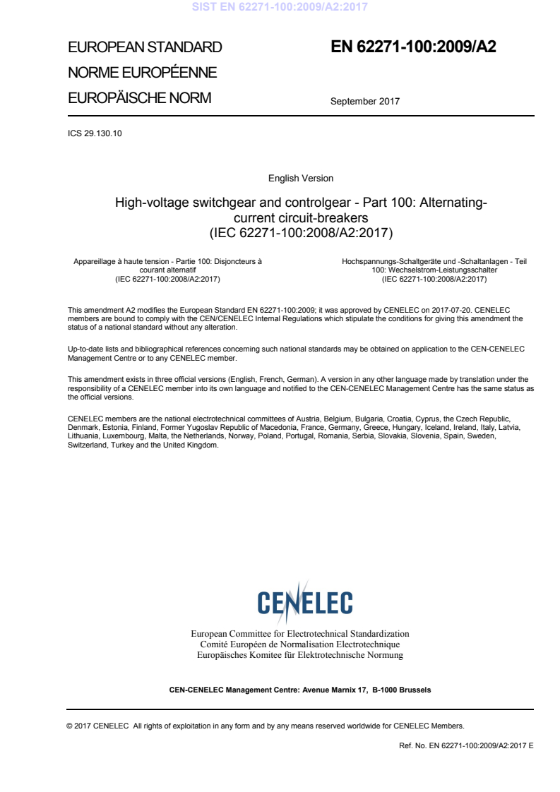 This amendment A2 modifies the European Standard EN 62271-100:2009; it was approved by CENELEC on 2017-07-20. CENELEC