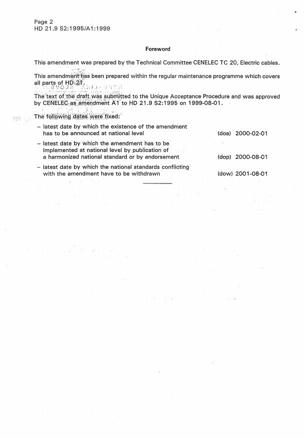 HD 21.9 S2:1995/A1:1999 is a amendment published by CLC. Its full title is "Polyvinyl chloride insulated cables of rated voltages up to and including 450/750 V - Part 9: Single core non-sheathed cable for installation at low temperatures". This standard covers: Will be withdrawn once EN 50525 series is ratified