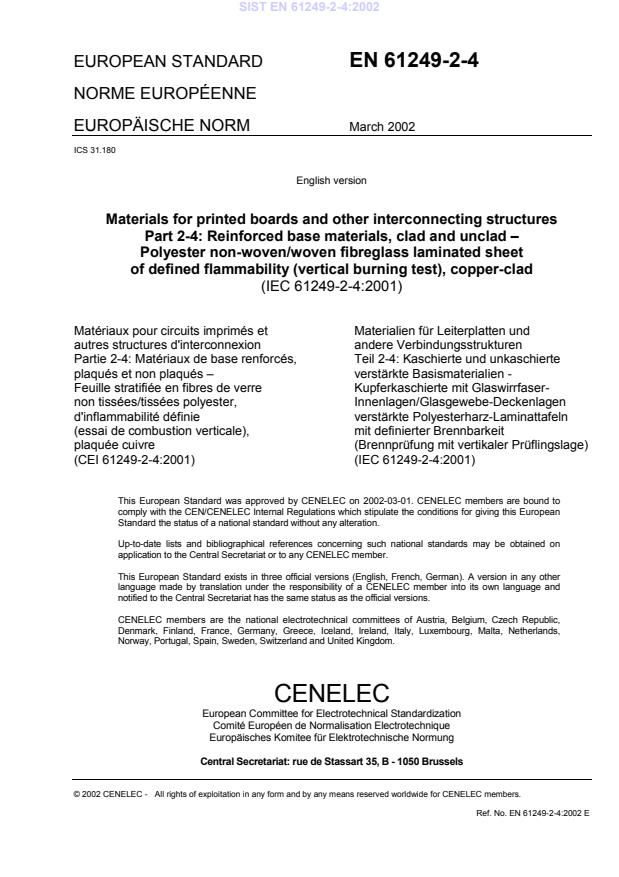 EN 61249-2-4:2002 (IEC 61249-2-4:2001) specifies requirements for polyester non-woven/woven fibreglass laminated sheets, copper-clad, used as reinforced base materials for printed boards and other interconnecting structures. Published by CENELEC (CLC) in 2002, the standard covers copper-clad laminates composed of polyester woven fibreglass surface layers and a polyester non‑woven fibreglass core, with defined flammability assessed by the vertical burning test. Applicable thickness range: 0.80 mm to 1.60 mm.