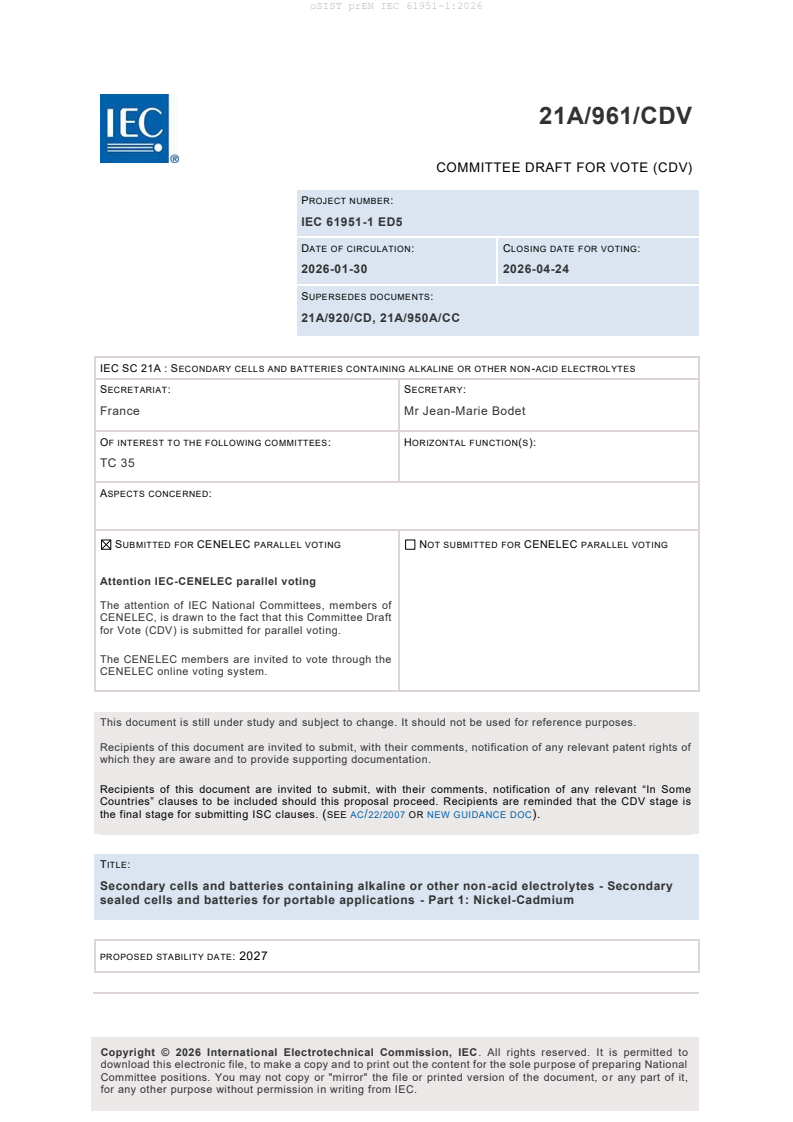 prEN IEC 61951-1:2026 is an international standard developed by CLC/IEC for secondary (rechargeable) sealed nickel-cadmium (Ni-Cd) cells and batteries containing alkaline or other non-acid electrolytes. Part 1 of this standard specifically focuses on secondary Ni-Cd cells and batteries designed for portable applications. The standard establishes uniform criteria for designation, marking, dimensions, electrical and mechanical testing, safety, and type approval.