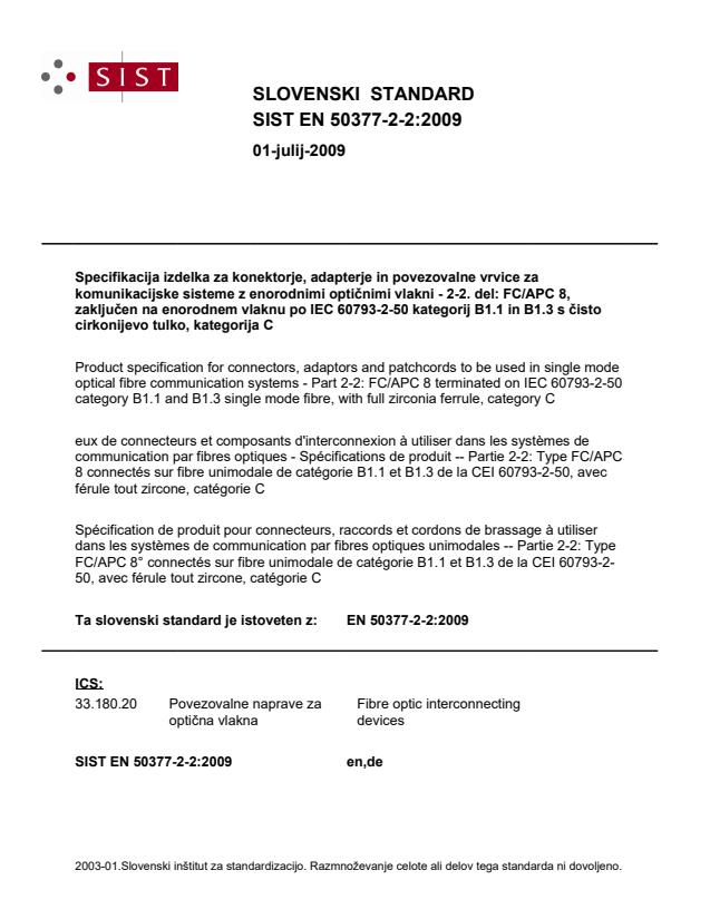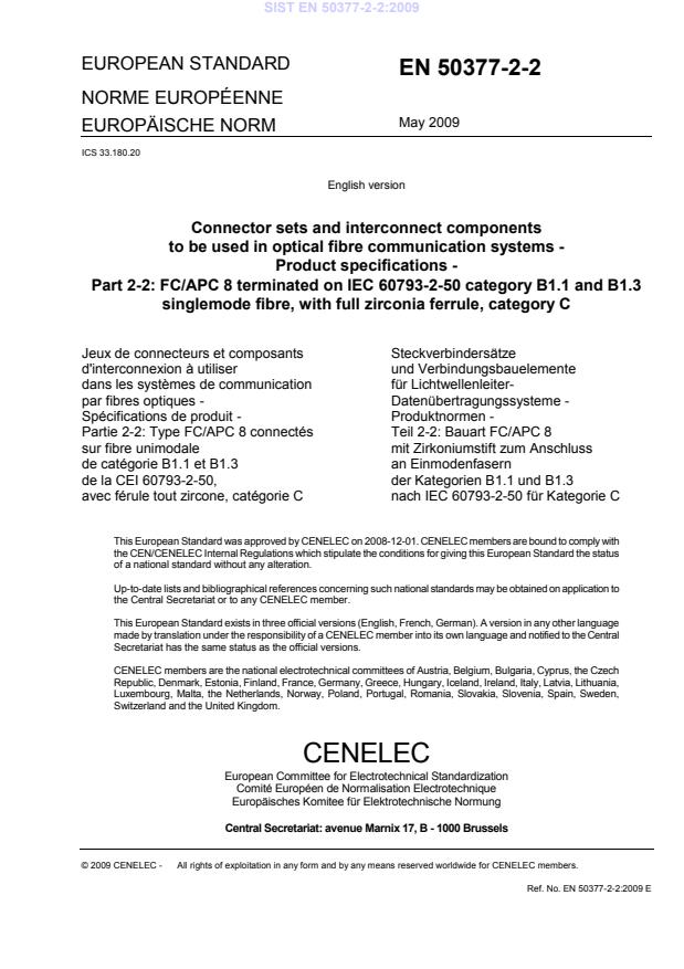EN 50377-2-2:2009 is a standard published by CLC. Its full title is "Connector sets and interconnect components to be used in optical fibre communication systems - Product specifications - Part 2-2: FC/APC 8 terminated on IEC 60793-2-50 category B1.1 and B1.3 singlemode fibre, with full zirconia ferrule, category C". This standard covers: 1.1 Product definition This European Standard contains the initial, start of life dimensional, optical, mechanical and environmental performance requirements which a connector terminated with cylindrical zirconia 8 degree angled PC ferrule and assembled singlemode resilient alignment sleeve FC-APC simplex connector set (plug/adaptor/plug), adaptor and patchcord must meet in order for it to be categorised as an EN standard product. Since different variants and grades of performance are permitted, product marking details are given in 3.5. 1.2 Intermateability Although all products conforming to the requirements of this standard will intermate, the resulting level of random attenuation performance will only be ensured in accordance with Table 1. The intention is that this will be true irrespective of the manufacturing source(s) of the product. When intermating plug variants have different attenuation grades, the resulting level of attenuation cannot be assured to be any better than the worst attenuation grade. The intermating of a grade C plug with a grade B plug will result in an uncertain level of random attenuation performance. 1.3 Operating environment The tests selected combined with the severities and durations are representative of a category U environment described in EN 61753-1. 1.4 Reliability Whilst the anticipated service life expectancy of the product in this environment is 20 years, compliance with this standard does not guarantee the reliability of the product. This should be predicted using a recognised reliability assessment programme. 1.5 Quality assurance Compliance with this standard does not guarantee the manufacturing consistency of the product. This should be maintained using a recognised quality assurance programme.