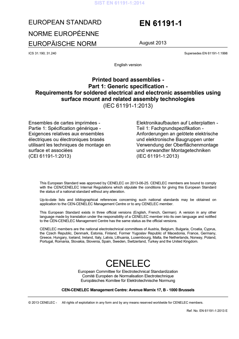 EN 61191-1:2013 is a standard published by CLC. Its full title is "Printed board assemblies - Part 1: Generic specification - Requirements for soldered electrical and electronic assemblies using surface mount and related assembly technologies". This standard covers: IEC 61191-1:2013 prescribes requirements for materials, methods and verification criteria for producing quality soldered interconnections and assemblies using surface mount and related assembly technologies. It also includes recommendations for good manufacturing processes. This edition includes the following significant technical changes with respect to the previous edition: - reference standard IEC 61192-1 has been replaced by IPC-A-610; - some of the terminology has been updated; - references to IEC standards have been corrected; - the use of lead-free alloys in the assembly have been added.