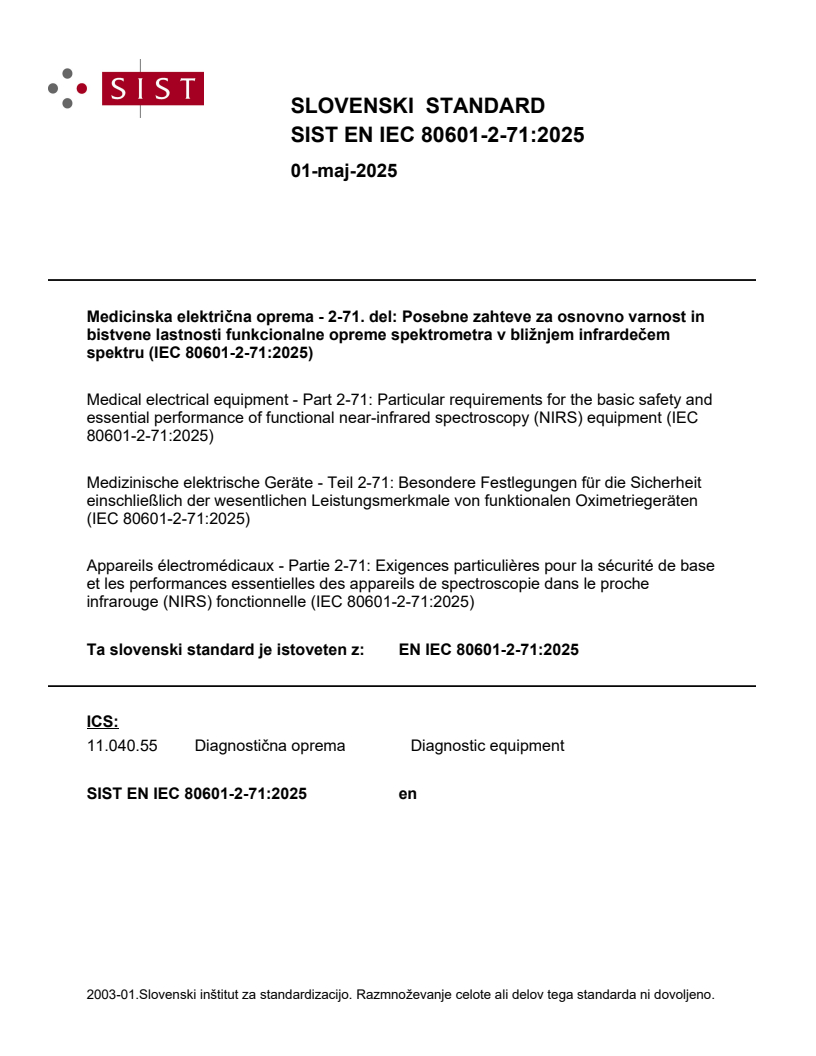 Medicinska električna oprema - 2-71. del: Posebne zahteve za osnovno varnost in bistvene lastnosti funkcionalne opreme spektrometra v bližnjem infrardečem spektru (IEC 80601-2-71:2025)