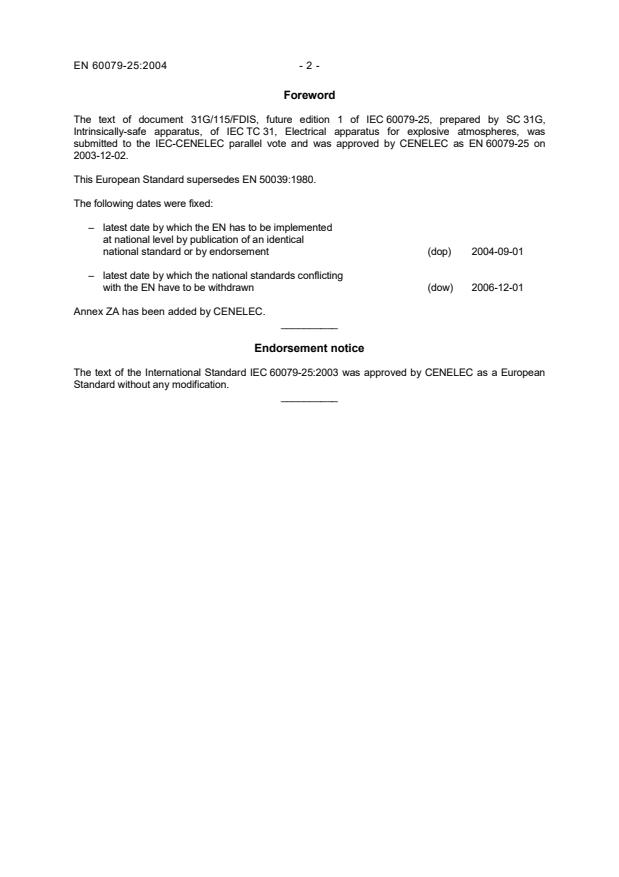 EN 60079-25:2004 is a standard published by CLC. Its full title is "Electrical apparatus for explosive gas atmospheres - Part 25: Intrinsically safe systems". This standard covers: Contains the specific requirements for construction and assessment of intrinsically safe electrical systems, type of protection "i", intended for use in explosive athmospheres in Group II locations.