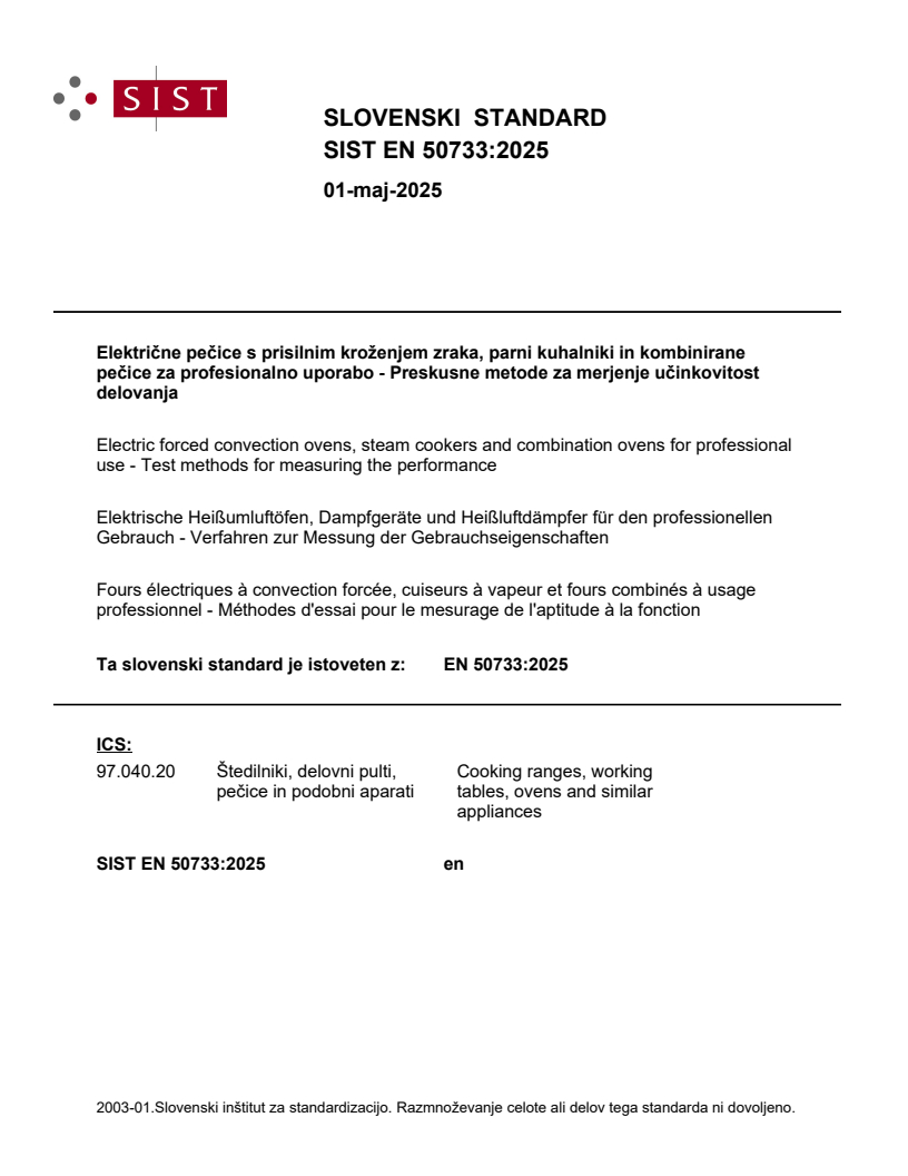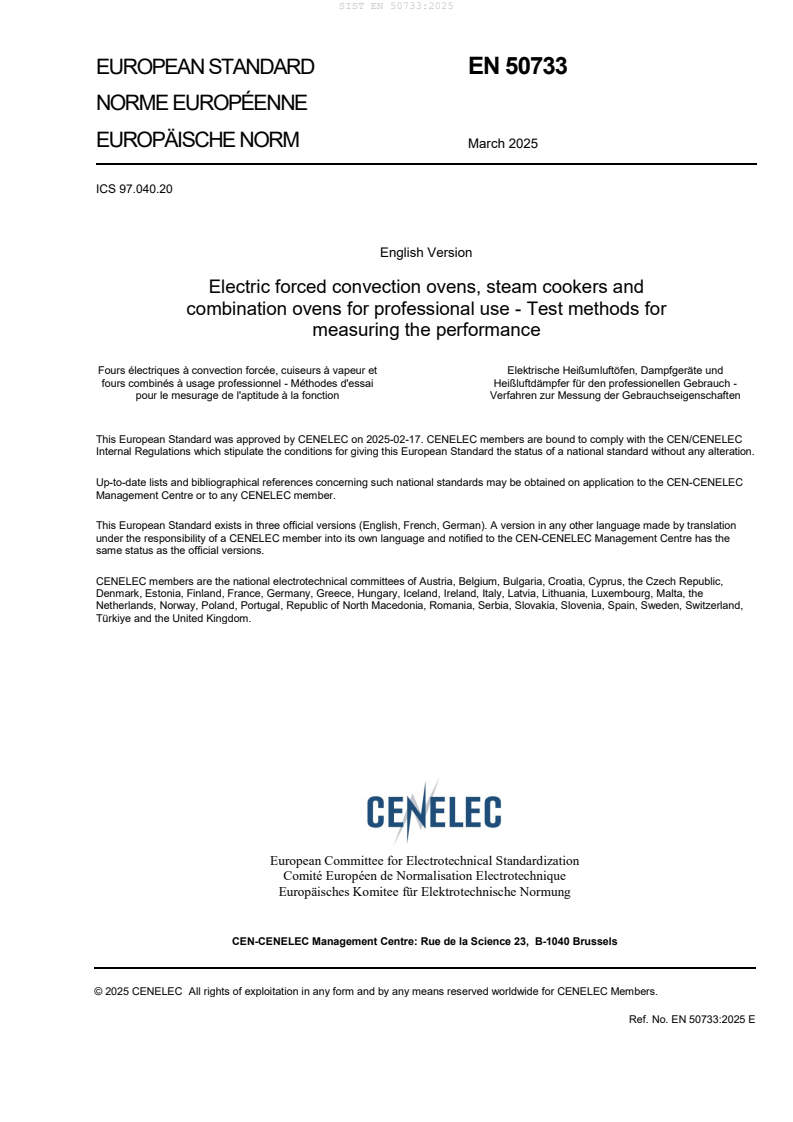 EN 50733:2025 - published by CLC/CENELEC - specifies standardized test methods for measuring the performance of electric forced convection ovens, steam cookers and combination ovens for professional use. It defines which appliances are covered (professional kitchen equipment used in restaurants, canteens, hospitals, butcher shops, etc.), the principal performance characteristics to be measured, and the required test conditions and procedures. The standard explicitly excludes pizza ovens, bakery and static ovens, pressure steam ovens, appliances designed only for rethermalizing, and equipment exclusively for industrial use. Note: EN 50733:2025 does not address safety, food quality or minimum performance requirements.