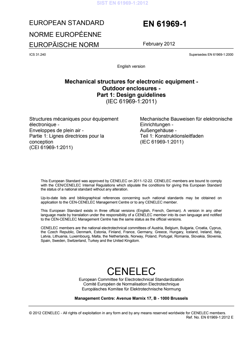 EN 61969-1:2012 is a standard published by CLC. Its full title is "Mechanical structures for electronic equipment - Outdoor enclosures - Part 1: Design guidelines". This standard covers: IEC 61969-1:2011 contains design guidelines for outdoor enclosures and is applicable over a wide field of mechanical, electromechanical and electronic equipment and its installation where a modular design is used. The objective of this standard is to provide an overview of specifications for enclosures focused on requirements for outdoor applications for stationary use at non-weather protected locations. These enclosures are considered to contain any equipment and provide protection for the outdoor installed facilities against unwanted environmental impacts. The installed equipment may be, but is not limited to, subracks according to IEC 60917-2-2 or IEC 60297-3-101. This second edition cancels and replaces the first edition issued in 1999. It constitutes a technical revision. The main technical changes with regard to the previous edition are as follows: - Addition of design guidance for thermal management and noise suppression as thermal/noise management is often considered a basic requirement of an empty outdoor enclosure. If thermal management components are included in the product, the environmental impact may become the responsibility of the empty outdoor enclosure manufacturer. Therefore the acoustic limitations shall be observed. Typically, the user of the empty outdoor enclosure follows the local regulatory acoustic requirements (sound power and/or sound pressure). Acoustic measurements may be performed on the empty outdoor enclosure fitted with thermal management components only or, if agreed between manufacturer and user at the final stage of the application specific installation. - Historically, Ed 1 intended to create a market for standardized empty outdoor enclosures offered by multiple vendors. Detail standards such as IEC 61969-2-1 Ed 1 and IEC 61969-2-2 Ed 1 were issued to guide users to preferred and available solutions. However, development showed that this intend (created with user's participation) was not satisfying the user's expectations. Consequently, the detail standards IEC 61969-2-1 Ed 1 and IEC 61969-2-2 Ed 1 will be withdrawn when IEC 61969-2 Ed 2 is issued. The IEC 61969-2 Ed 2 co-ordination dimensions are based on IEC 60917-1. The definition outdoor cases and outdoor cabinets are merged into the definition outdoor enclosures.
