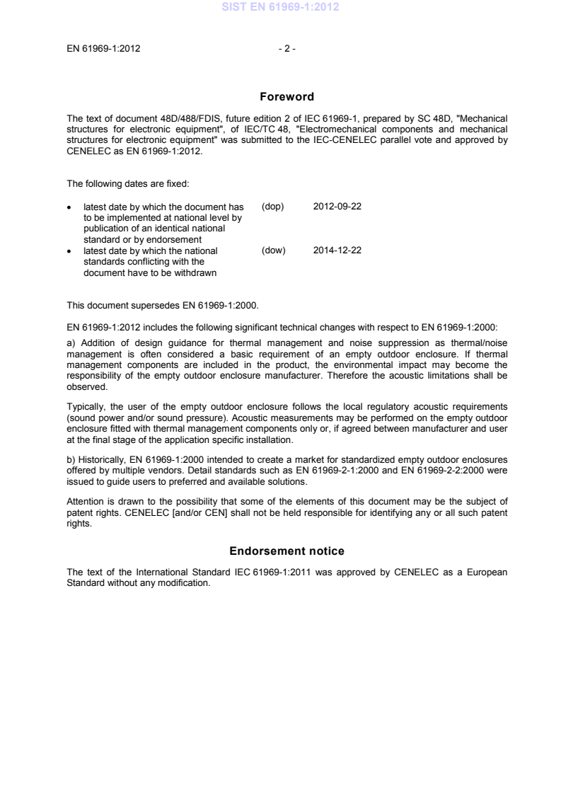 Foreword The text of document 48D/488/FDIS, future edition 2 of IEC 61969-1, prepared by SC 48D, "Mechanical structures for electronic equipment", of IEC/TC 48, "Electromechanical components and mechanical structures for electronic equipment" was submitted to the IEC-CENELEC parallel vote and approved by CENELEC as EN 61969-1:2012.