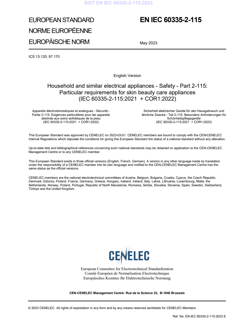 EN IEC 60335-2-115:2023 (CLC) is the European adoption of IEC 60335-2-115:2021 + COR1:2022 and specifies safety requirements for skin beauty care appliances intended for household, commercial and similar use with rated voltages up to 250 V. It is Part 2 of the IEC 60335 series and is intended to be used in conjunction with IEC 60335-1 (general requirements for household and similar electrical appliances). Approved by CENELEC in 2023, this standard consolidates particular requirements, tests and informative annexes specific to aesthetic skin-care devices.