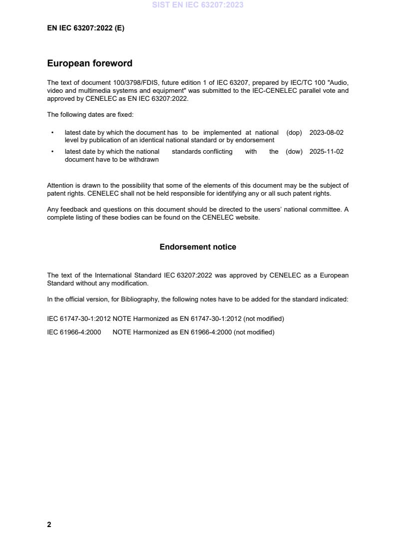 - IEC 61747‑30‑1 and IEC 61966‑4:2000 are referenced harmonized documents noted in the EN IEC 63207:2022 bibliographic information.