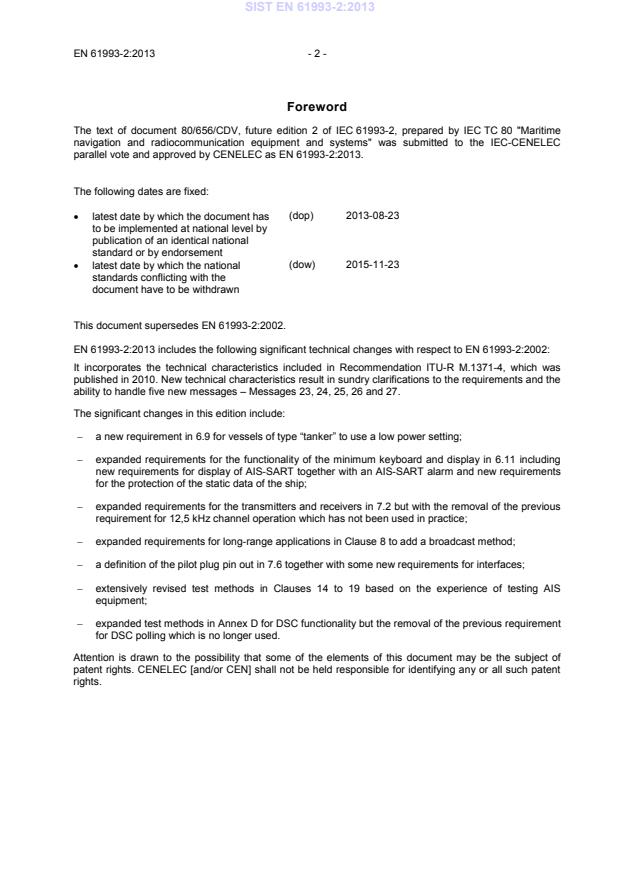 This document supersedes EN 61993-2:2002. EN 61993-2:2013 includes the following significant technical changes with respect to EN 61993-2:2002: It incorporates the technical characteristics included in Recommendation ITU-R M.1371-4, which was published in 2010. New technical characteristics result in sundry clarifications to the requirements and the ability to handle five new messages – Messages 23, 24, 25, 26 and 27. The significant changes in this edition include: − a new requirement in 6.9 for vessels of type “tanker” to use a low power setting; − expanded requirements for the functionality of the minimum keyboard and display in 6.11 including new requirements for display of AIS-SART together with an AIS-SART alarm and new requirements for the protection of the static data of the ship; − expanded requirements for the transmitters and receivers in 7.2 but with the removal of the previous requirement for 12,5 kHz channel operation which has not been used in practice; − expanded requirements for long-range applications in Clause 8 to add a broadcast method; − a definition of the pilot plug pin out in 7.6 together with some new requirements for interfaces; − extensively revised test methods in Clauses 14 to 19 based on the experience of testing AIS equipment; − expanded test methods in Annex D for DSC functionality but the removal of the previous requirement for DSC polling which is no longer used. Attention is drawn to the possibility that some of the elements of this document may be the subject of patent rights. CENELEC [and/or CEN] shall not be held responsible for identifying any or all such patent rights.