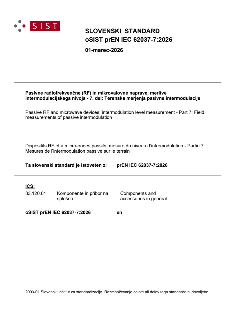 prEN IEC 62037-7:2026 is part of the broader IEC 62037 series, which provides comprehensive guidelines on passive intermodulation level measurements for RF and microwave devices. Closely related standards include: