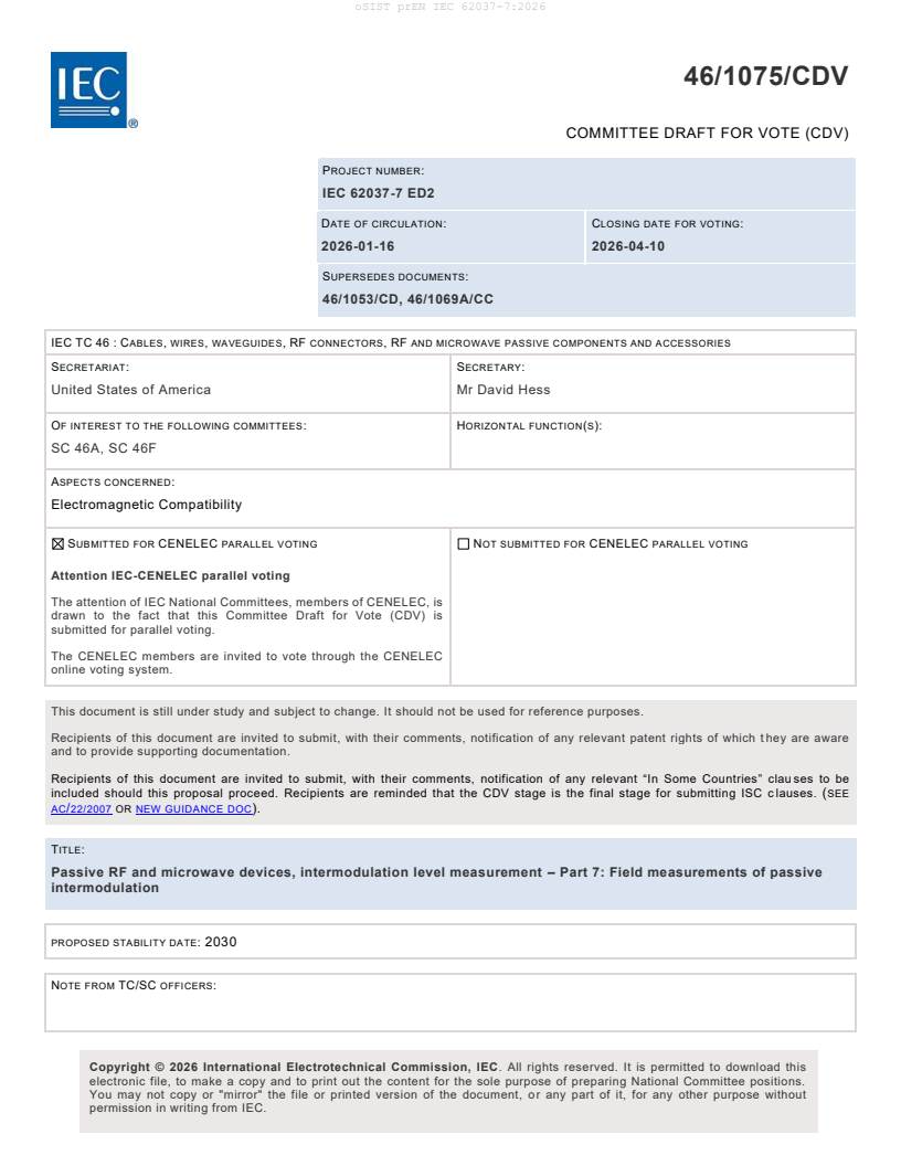 prEN IEC 62037-7:2026 establishes standardized methods for conducting field measurements of passive intermodulation (PIM) in passive RF and microwave devices. Developed by the International Electrotechnical Commission (IEC), this part of the IEC 62037 series is specifically focused on verifying the intermodulation performance of RF systems as installed and operated in real-world environments. The standard addresses test procedures, equipment, safety, and guidelines for minimization and accurate detection of passive intermodulation in field deployments such as distributed antenna systems (DAS) and antenna feed systems.