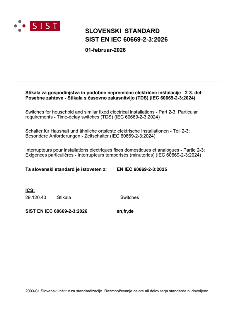 Stikala za gospodinjstva in podobne nepremične električne inštalacije - 2-3. del: Posebne zahteve - Stikala s časovno zakasnitvijo (TDS) (IEC 60669-2-3:2024)