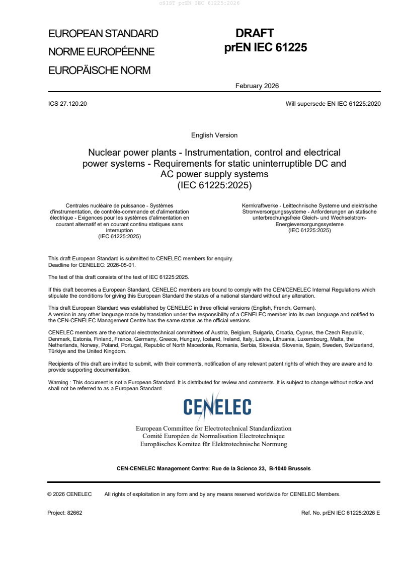 prEN IEC 61225:2026 is a draft published by CLC. Its full title is "Nuclear power plants - Instrumentation, control and electrical power systems - Requirements for static uninterruptible DC and AC power supply systems". This standard covers: See the scope of IEC 61225:2025. Adoption is to be implemented without modification.