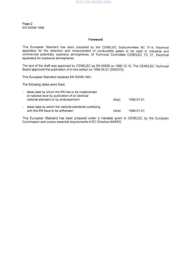 EN 50058:1998 is a standard published by CLC. Its full title is "Electrical apparatus for the detection and measurement of combustible gases - Performance requirements for Group II apparatus indicating up to 100 % (v/v) gas". This standard covers: This European Standard specifies performance requirements for Group II (as defined in EN 50054) portable, transportable and fixed apparatus for the detection and measurement of combustible gas or vapour concentrations with air. The apparatus, or parts thereof, may be installed or used in potentially explosive atmospheres, other than mines susceptible to firedamp (i.e. Group I). The general requirements and test methods applicable to the apparatus covered by this European Standard are specified in EN 50054.This European Standard is restricted to apparatus intended for the detection and measurement of volume ratios of combustible gas or vapour in air from 0 % (v/v) to 100 % (v/v).NOTE 1: Apparatus covered by this European Standard will normally be intended to operate in volume ratios greater than 100 % LEL. NOTE 2: Although apparatus of the types covered by this European Standard may be suitable for detecting a wide range of combustible gases, particular gases (e.g. methane or propane) are specified in EN 50054 as the components of the test gases for the purpose of practical convenience. The performance requirements specified in this European Standard must therefore be regarded with caution when the apparatus is used to detect other combustible gases, as some parameters - such as time of response - will be modified