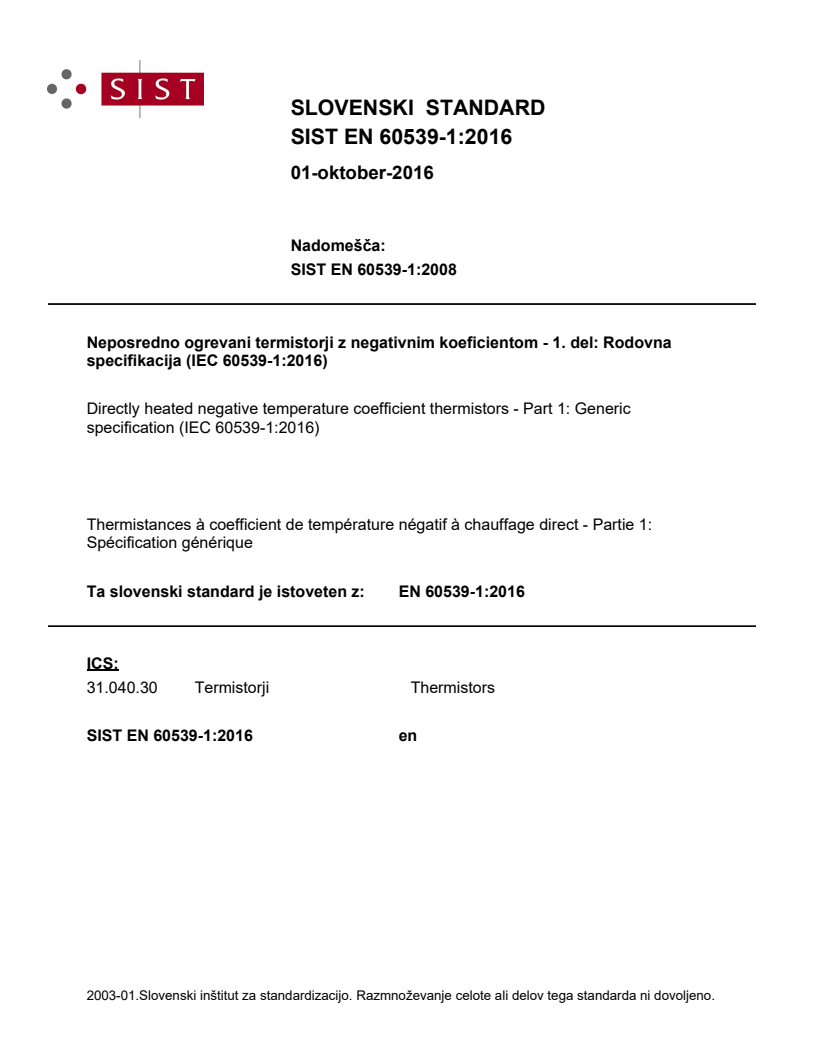 Neposredno ogrevani termistorji z negativnim koeficientom - 1. del: Rodovna specifikacija (IEC 60539-1:2016)