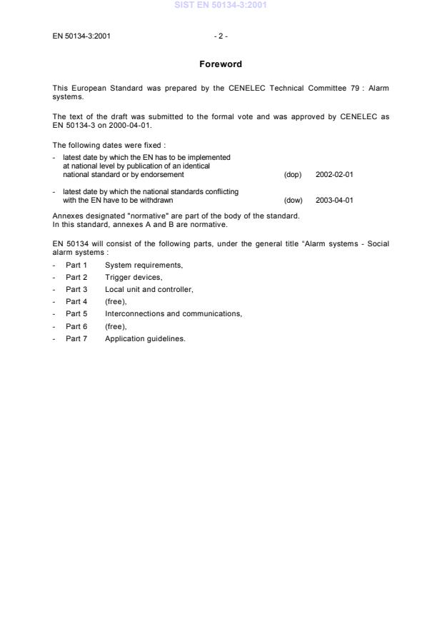 EN 50134-3:2001 is a standard published by CLC. Its full title is "Alarm systems - Social alarm systems - Part 3: Local unit and controller". This standard covers: This standard specifies the requirements and tests for local units and controllers forming part of a social alarm system. This standard applies to local units and controllers that receive an alarm triggering signal from manually or automatically activated trigger devices and convert this into an alarm signal for transmission to the alarm receiving centre or an alarm recipient. The local unit and controller are either separate units or integrated into one unit. This standard does not specify EMC emission or electrical safety requirements. These are covered by other standards.