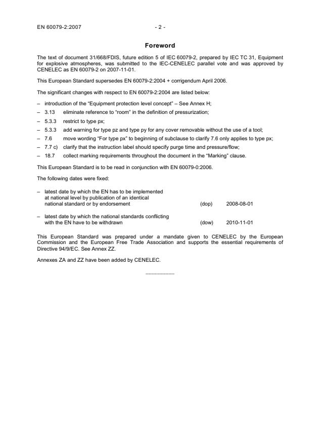 The significant changes with respect to EN 60079-2:2004 are listed below: