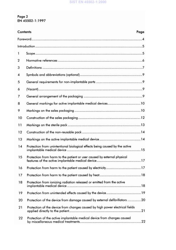 This Part 1 of EN 45502 specifies requiremnets that are generally applicable to ACTIVE IMPLANTABLE MEDICAL DEVICES. For particular types of ACTIVE IMPLANTABLE MEDICAL DEVICES, these essential requirements are supplemented or modified by the requirements of particular standards which form additional parts of this European Standard. The test that are specified in EN 45502 are type tests and are to be carries out on samples of a device to show compliance. This Part of EN 45502 is applicable not only to ACTIVE IMPLANTABLE MEDICAL DEVICES that are electrically powered but also to those powered by other energy sources ( for example by gas pressure or by springs.). This Part of EN 45502 is also applicable to some non-implantable parts and accessories of the devices (see note 1). NOTE 1: The device that is commonly referred to as an ACTIVE IMPLANTABLE MEDICAL DEVICES may in fact be a single device, a combination of devices, or a combination of a device or devices and one or more accessories. Not all of these parts are required to be either partially or totally implantable, but there is a need to specify some requirements of non- implantable parts and accessories if they could affect safety or performance of the implantable device. NOTE 2: The terminology used in this European Standard is intended to be consistent with the terminology of Directive 90/385/EEC. NOTE 3: In this European Standard, terms printed in SMALL CAPITAL LETTERS are used as defined in clause 3. Where a defined term is used as a qualifier in another term, it is not printed in small capital letters unless the concept thus qualified is also defined.