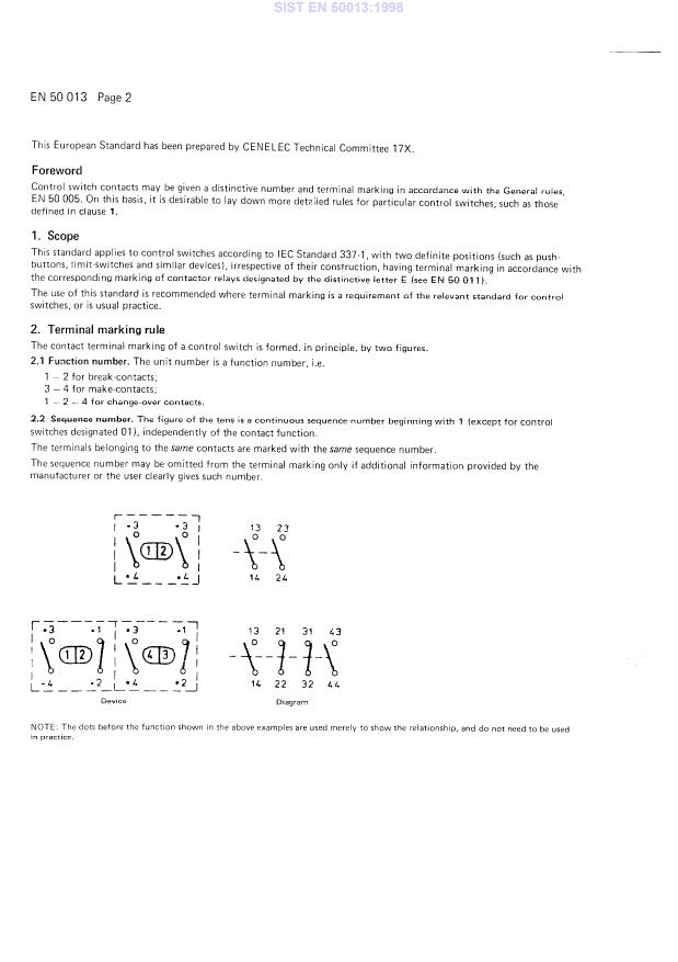 This standard applies to control switches according to IEC Standard 337-1, with two definite positions (such as push-buttons, limit-switches and similar devices), irrespective of their construction, having terminal marking in accordance with the corresponding marking of contactor relays designated by the distinctive letter E (see EN 50 011). The use of this standard is recommended where terminal marking is a requirement of the relevant standard for control switches, or is usual practice