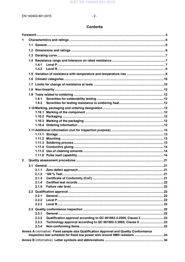 Contents Foreword . 4 1 Characteristics and ratings . 6 1.1 General . 6 1.2 Dimensions and ratings . 6 1.3 Derating curve . 7 1.4 Resistance range and tolerance on rated resistance . 7 1.4.1 Level P . 7 1.4.2 Level R . 8 1.5 Variation of resistance with temperature and temperature rise . 9 1.6 Climatic categories . 10 1.7 Limits for change of resistance at tests . 10 1.8 Non-linearity . 12 1.9 Tests related to soldering . 12 1.9.1 Severities for solderability testing . 12 1.9.2 Severities for testing resistance to soldering heat . 12 1.10 Marking, packaging and ordering designation . 12 1.10.1 Marking of the component . 12 1.10.2 Packaging . 12 1.10.3 Marking of the packaging . 12 1.10.4 Ordering information . 12 1.11 Additional information (not for inspection purpose) . 13 1.11.1 Storage . 13 1.11.2 Mounting . 13 1.11.3 Soldering process . 13 1.11.4 Conductive gluing . 14 1.11.5 Use of cleaning solvents . 14 1.11.6 Pulse load capability . 14 2 Quality assessment procedures . 21 2.1 General . 21 2.1.1 Zero defect approach . 21 2.1.2 100 % Test . 21 2.1.3 Certificate of Conformity (CoC) . 21 2.1.4 Certified test records . 22 2.1.5 Failure rate level . 22 2.2 Qualification approval . 22 2.2.1 General . 22 2.2.2 Level P . 22 2.2.3 Level R . 22 2.3 Quality conformance inspection . 22 2.3.1 General . 22 2.3.2 Qualification approval according to QC 001002-3:2005, Clause 3 . 23 2.3.3 Technology approval according to QC 001002-3:2005, Clause 6 . 23 2.3.4 Non-conforming items . 23 Annex A (normative)
