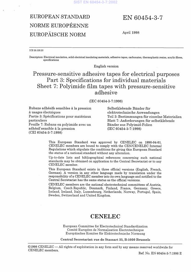EN 60454-3-7:1998 (adopted as a CLC/EN sheet) specifies requirements for pressure-sensitive adhesive tapes made from polyimide film for electrical purposes. The standard covers four tape types with nominal thicknesses from 0.020 mm to 0.055 mm, and thermal performance indexed between 155 °C and 180 °C, using acrylic crosslinked and silicone thermosetting adhesives. EN 60454-3-7 is part of the broader EN/IEC 60454 series for pressure-sensitive tapes used in electrical and electronic applications.