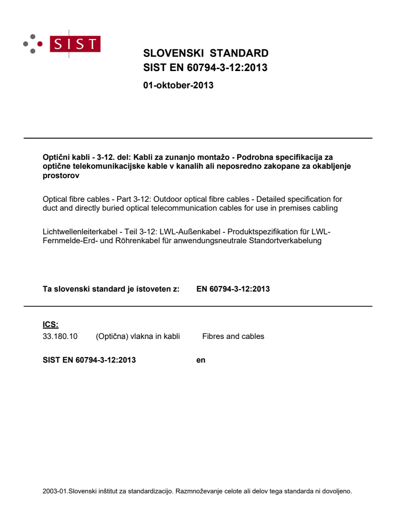 Optični kabli - 3-12. del: Kabli za zunanjo montažo - Podrobna specifikacija za optične telekomunikacijske kable v kanalih ali neposredno zakopane za okabljenje prostorov