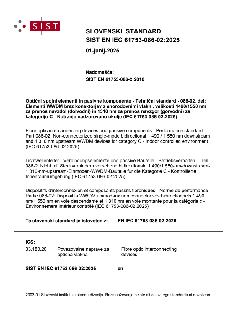 Optični spojni elementi in pasivne komponente - Tehnični standard - 086-02. del: Elementi WWDM brez konektorjev z enorodovnimi vlakni, velikosti 1490/1550 nm za prenos navzdol (dolvodni) in 1310 nm za prenos navzgor (gorvodni) za kategorijo C - Notranje nadzorovano okolje (IEC 61753-086-02:2025)